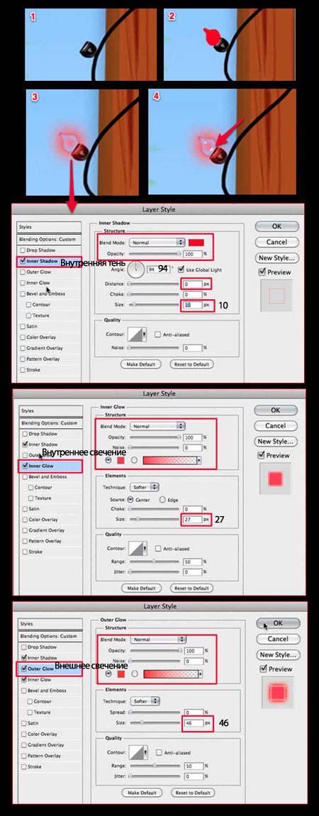 3. К слою с лампочкой добавьте стили слоя Внутреннюю тень (Inner Shadow), Внутреннее свечение (Inner Glow) и Внешнее свечение (Outer Glow), примените настройки, которые указаны на скриншоте ниже.