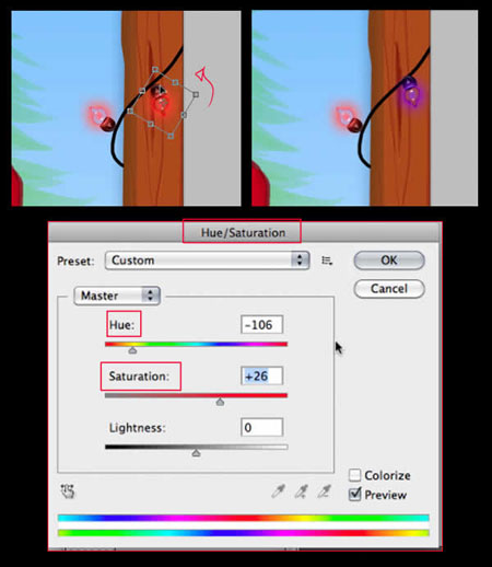 Объедините все слои с лампочкой, продублируйте, поменяйте цвет лампочки с помощью цветовой коррекции Цветовой тон / Насыщенность (Hue/Saturation (Ctrl-U), измените направление лампочки. Расположите дубликаты слоёв с лампочками по всей длине провода.