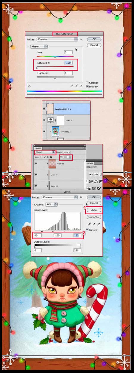 Расположите текстуру между слоем с девочкой и рамкой. Активируйте цветовую коррекцию Цветовой тон / Насыщенность (Hue/Saturation), установите значение Насыщенности (Saturation) на 0. Поменяйте режим наложения для данного слоя с текстурой на Умножение (Multiply), а затем уменьшите непрозрачность слоя до примерно 44%. Активируйте Уровни (Levels (Ctrl-L), вначале нажмите кнопку АВТО (AUTO), а затем установите уровни, как показано на скриншоте ниже.