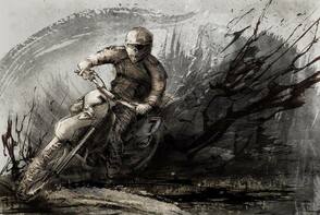 Выберите жёсткую кисть, размер кисти 2px - 3px, цвет кисти близкий к белому цвету (#fff0e2) и с помощью техники перекрёстной штриховки, добавьте световые блики. Это поможет немного выделить мотогонщика на фоне текстур и эффектов, которые мы создали и применили.