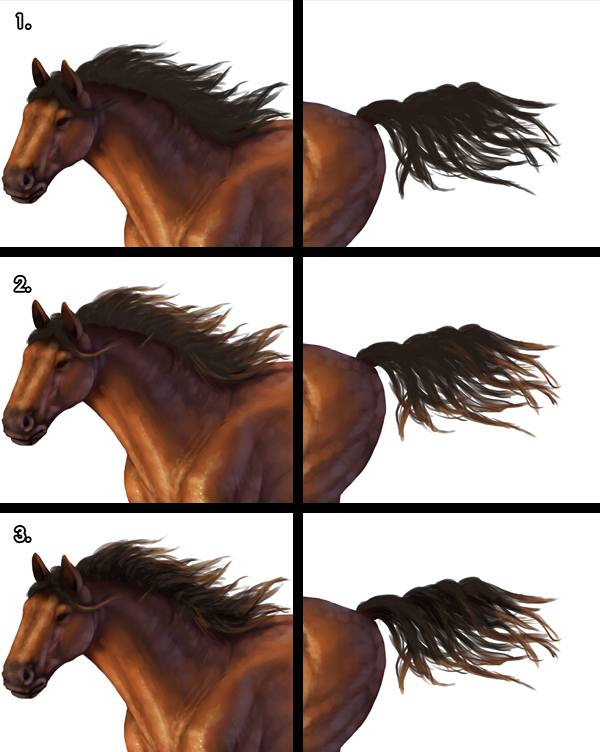 - Не пытайтесь затенить каждый волос! Фокусируйтесь на прядях целиком. Уровень детализированности должен быть равномерным во всем рисунке, и если вы прорисуете каждый волосок на гриве, придется также прорисовывать их и на шкуре!