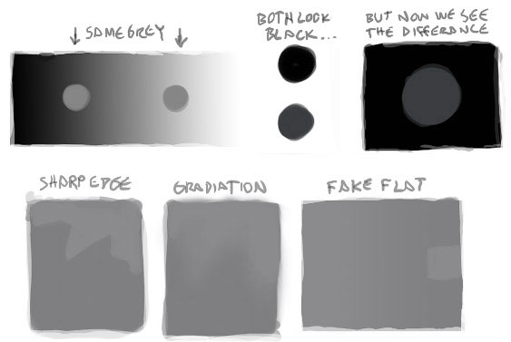 Примечание переводчика: на скриншоте: 1) Один и тот же серый цвет 2) Оба круга выглядят черными… 3) Но теперь мы видим разницу 4) Жесткий край 5) Градиент 6) Ложно плоский; На последней иллюстрации - «ложно плоский» вы можете увидеть, что прямоугольник кажется плоским, но на деле это градиент: светлый квадрат справа того же цвета, что и левая часть «плоского» прямоугольника.