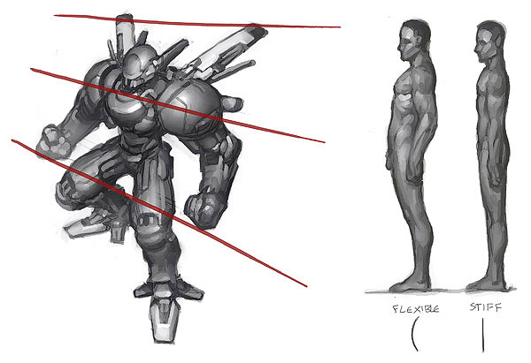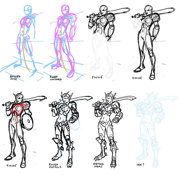 Примечание переводчика: на рисунке: жесткая поза; объемы тела; доработка; доработка; доработка; набросок деталей; идеи деталей; краска?