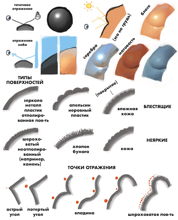 - Одежда - почти нет точек отражения, только свет и тень. Если ткань очень тонкая, то свет может проходить через нее, создавая некое рассеивание.