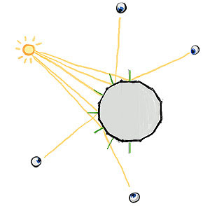 Фактически, свет есть только один, и он просто отражается. Вы можете увидеть свет (то есть фотон) только в том случае, если он попадает на сетчатку глаза. Когда свет касается поверхности, он делает две важных вещи: во-первых, какая-то его часть поглощается - так рождаются цвета. Красное яблоко отражает по большей части, условно говоря, красные длины волн, остальные поглощаются, превращаясь в тепло или что-то вроде того. Поэтому черные предметы нагреваются на солнце. В любом случае, свет всегда отражается от разных поверхностей по-разному. Если поверхность неровная, он отражается как бы случайным образом, как теннисный мяч, который ударяется о каменистую террасу. Если поверхность гладкая, то угол отражения света можно предугадать. Зеркало, например, очень гладкое, так что свет отражается от него, не искажаясь, и мы, соответственно, можем увидеть наше отражение.