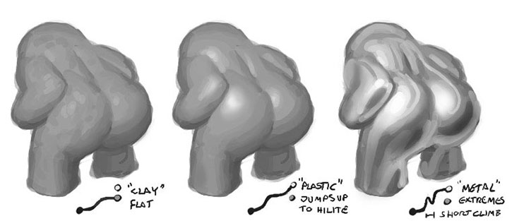 Примечание переводчика: на скриншоте изображена схема перехода от тени к свету в различных материалах: 1) плоская «глина» - плавный переход 2) «пластик» - более резкий скачок от тени к свету 3) «металл» - очень резкий подъем от тени к свету
