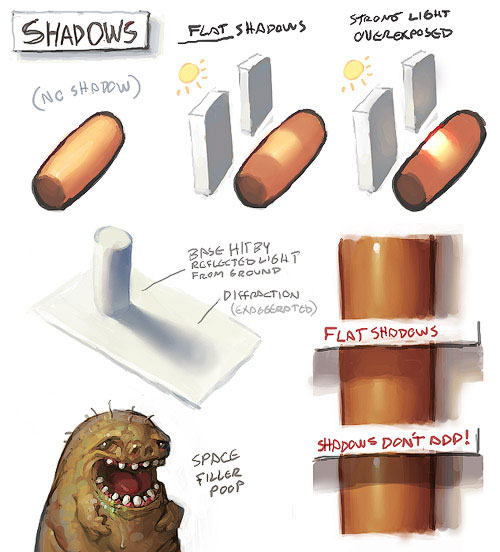 Примечание переводчика: на скриншоте (нумерация сверху, слева направо): ТЕНИ 1) Нет теней 2) Плоские тени 3) Яркий свет, переэспонирование 4) На основание цилиндра падает свет, отраженный от земли; дифракция (преувеличенная) 5) Плоские тени; (ниже) тени не накладываются друг на друга (т. е. не умножаются)!