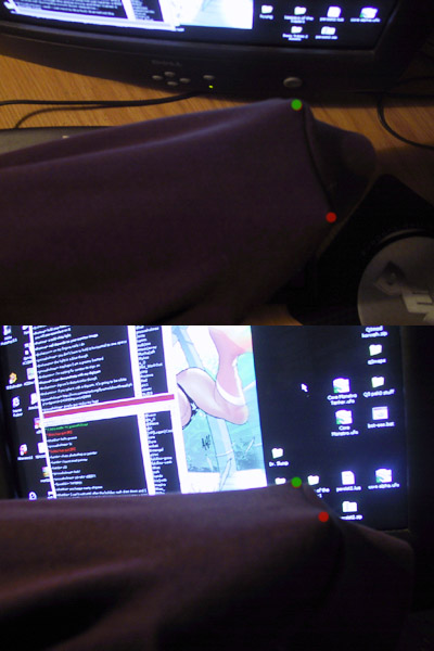 Фото 1. Отражения, хоть и слабые, присутствуют и на одежде. Я растянул рукав своей майки двумя пальцами, чтобы получить плоскую поверхность между двумя помеченными точками (я двигал камеру, не рукав).