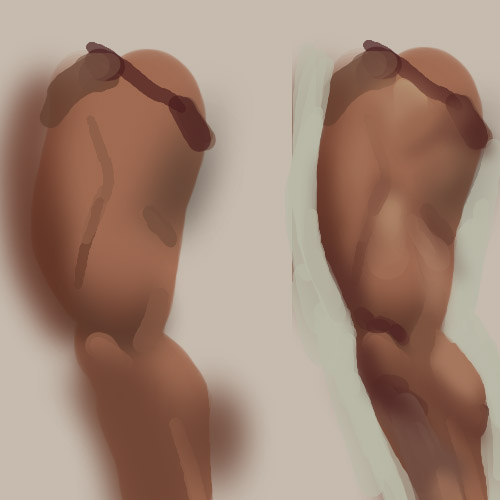 На человеческом теле вы можете обнаружить множество различных оттенков. Например, части тела, закрытые одеждой, загорают меньше. Области лобка, тазобедренной кости и грудной клетки достаточно бледны. Плечи и предплечья зачастую загорают сильнее. Однако, обратная сторона предплечья в большинстве случаев будет бледнее. На коленях и локтях кожа немного темнее. На лице также вы можете обнаружить множество оттенков, как, например, розовые щеки, а у мужчин челюсть может быть серой или почти зеленой из-за щетины. Наилучший способ разобраться с оттенками человеческого тела - это, конечно, провести исследования. Не забывайте, что животные, монстры и предметы также обладают множеством оттенков. Если вы будете изображать все одним тоном с одинаковой насыщенностью, выйдет достаточно скучно.