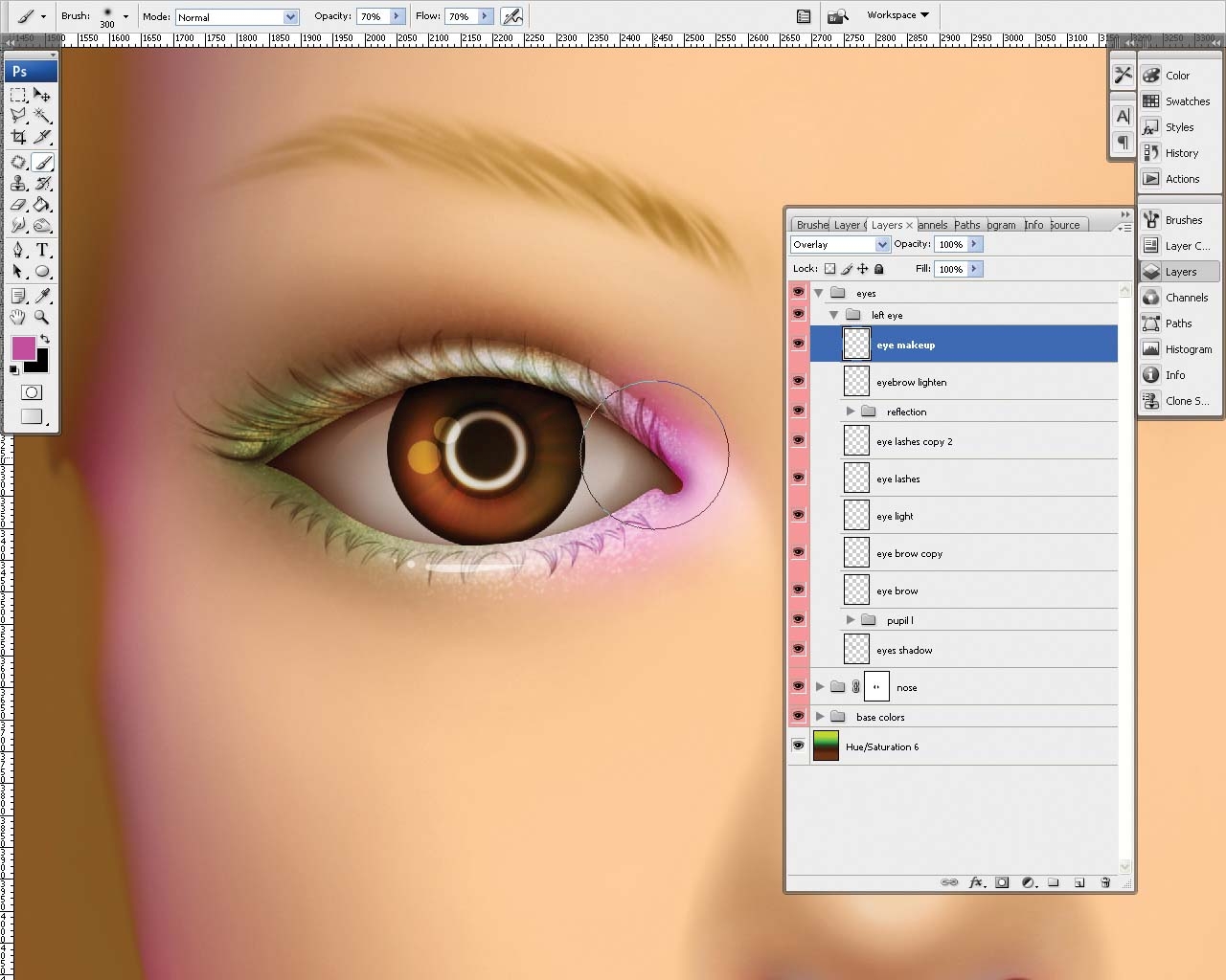 Добавьте немного макияжа при помощи кисти розового, серого и зеленого цветов по краям глаз и измените режим наложения на Overlay (Перекрытие). Продублируйте всю группу, а затем отразите ее так, чтобы она поместилась на правый глаз. Обратите внимание на детали, такие как направление световых бликов, дабы избежать излишней симметричности.