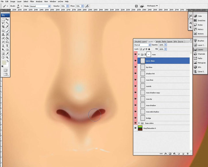 Теперь добавьте цвет носу. С режимом наложения темных теней Multiply (Умножение), примените Gaussian Blur (Размытие по Гауссу) радиусом 2 пикселя, чтобы смягчить ноздри. При помощи мягкой кисти добавьте сияние на кончике носа, а также на его нижней части, как показано на изображении ниже.