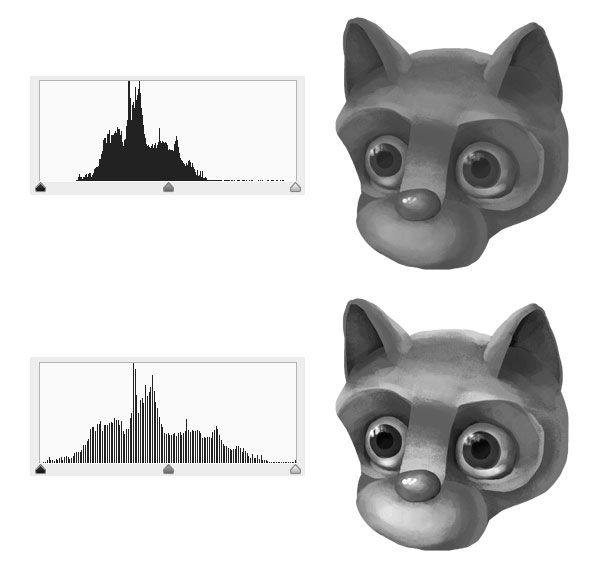 Вы можете изменить уровни, потянув за слайдеры. В то время как это уменьшает общее количество тонов, это помогает поместить их на верное место в гистограмме.