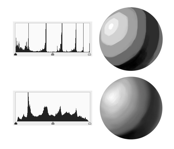 Видите все эти части на гистограмме? Когда мы объединим их, вот что произойдет. Воспользуйтесь этой сферой, как набором образцов для вашего предмета, затеняя его таким же способом - самая темная тень, средний тон, самый яркий свет, самые темные места и самые яркие блики. А потом все это можно смешать!