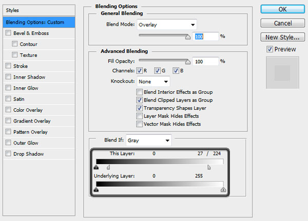 Из этого можно сделать еще один вывод. Если свет создает видимую текстуру, без света не может быть никакой текстуры. А что такое тень, если не недостаток света? Следовательно, нам необходимо уменьшить видимость текстуры в темных областях (если присутствует отраженный свет), или убрать ее вовсе (нет света - нет текстуры). Вы можете воспользоваться для этого слой-маской или поиграть со слайдерами Blend If (Наложение, если) (второй ряд). Помните, что углубления в текстуре на самом деле - это тени, так что они не должны быть темнее, чем «обычная» область тени.