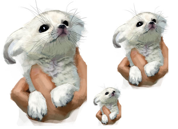 Когда вы используете разрешение больше, чем нужно, вам может захотеться добавить пару деталей тут и там, просто потому, что можно. И если вы начнете это делать, пути назад не будет. Есть множество уровней детализации, но конкретный рисунок должен соответствовать только одному из них единовременно. Если вы хотите быстро создать красивую шерсть, не тратьте часы на глаза и нос - из-за этого весь рисунок лишь будет выглядеть раздробленным и незавершенным.