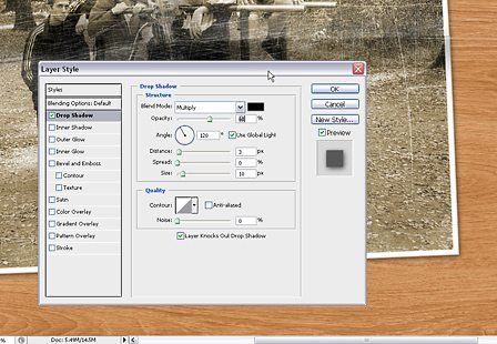 Теперь выбираем слой с фотографией, делаем двойной клик на нем – чтобы открыть стили слоя. Нам нужна падающая тень (Drop Shadow) – ставим в ней галку. Так как фотка лежит у нас на деревянной поверхности, то большой тени не будет – выставляем ей небольшое значение и небольшую прозрачность. Думаю, такие значения как у меня вполне подойдут: