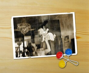Можно не прилеплять фотку скотчем а имитировать, что она просто лежит на столе. Поместив на изображение другие предметы интерьера (кружку кофе, зажигалку, ручку, скрепку – любую бытовуху) – картинка моментально оживет.