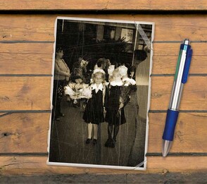 Далее склеиваем слои с царапинами. Группируем получившийся слой с фотографией – CTRL+G (Group). Сразу после этого жмем CTRL+T – это вызовет операцию трансформации. Дальше кликаем пером на любой угол фотографии и немного отдаляем его от центра фотографии – чтобы активизировался инструмент поворота (Rotate) – слегка поворачиваем фотографию и жмем Enter.