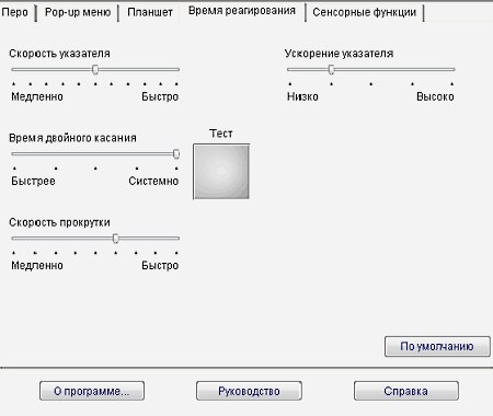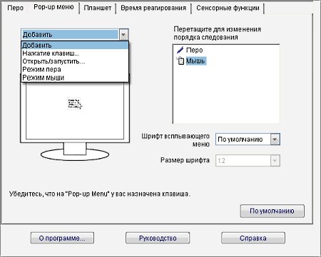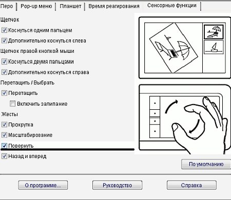 Планшет: Настройки клавиш планшета по своему желанию, ориентация планшета для правши или левши, а также отключения функций сенсорного ввода (мультитач).