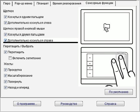- Прикосновение двумя пальцами одновременно вызывает клик правой кнопки мыши.