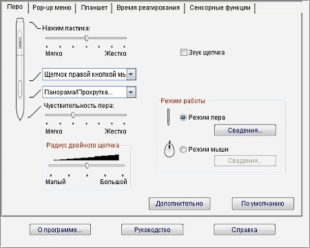 Перо: Меню настроек пера, где можно задать силу нажатия наконечника пера и ластика, назначить различные функции для клавиш, изменить размеры рабочей области планшета и ее пропорции.