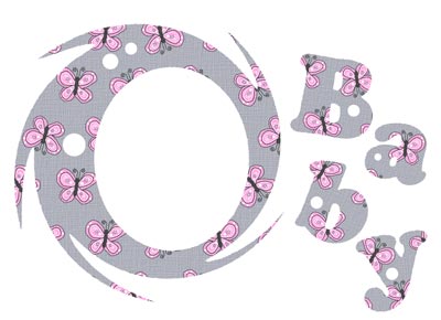Инструментом Горизонтальный текст-маска я вырезаю из слоя "Ткань с бабочками" по одной буковке, подбираю наиболее понравившийся мне участок рисунка. (Хотя можно вырезать и все слово целиком на один слой). Вот так: