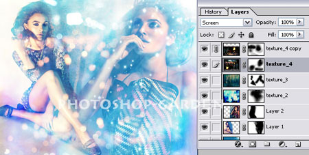 Откройте texture 1. Примените для нее Способ смешивания слоев на Screen (осветление). Вот что должно получиться: