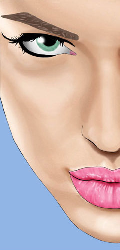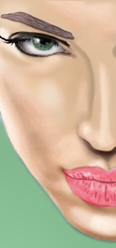 (размазывание)). Я дублировала слой с бровями и применила к верхнему слою blending option (режимы смешивания) так, чтобы видны были оба слоя с бровями. Так брови смотрятся гуще. Самый первый слой с черными контурами был закрашен, чтобы смешать контуры с прилегающими участками, но не полностью.