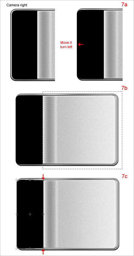 Шаг 7. Создайте новый слой над слоем “camera 1”, назовите его “camera right”. Переместите его немного влево. Повторите шаг 2. Сделайте выделение как показано на рисунке (7b) и нажмите Delete.
