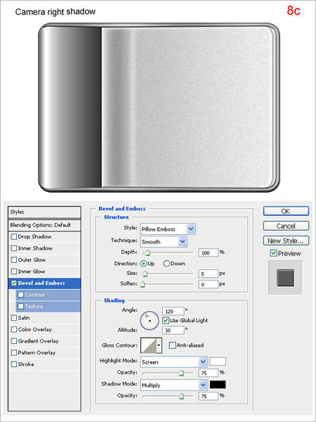 Шаг 8. Дублируйте слой “camera right”, переименуйте новый слой в “camera right shadow”. Переместите его под слой “camera right” (8a). Удалите стили слоя (8b) и примените новые(8c)