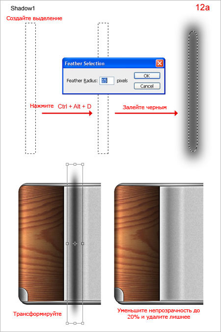 (Прямоугольник с закругленными углами) с радиусом 20 пикселей, нарисуйте форму как на рисунке (10a) и залейте ее любым цветом(10b). Удерживая CTRL, кликните по слою “Wood texture”, чтобы выделить его содержимое. Нажмите сочетание SHIFT + CTRL + I для инвертирования выделения и нажмите Delete (10c). Примените стили слоя (10d).