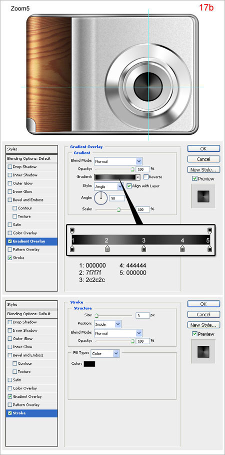 Шаг 17. Создайте новый слой, назовите его “zoom5”, нарисуйте круг (17а). Примените стили слоя (17b).