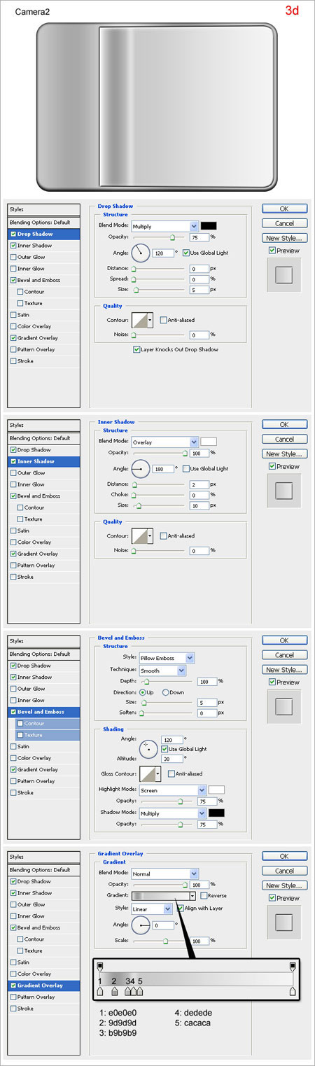 Шаг 4. Дублируйте слой “camera2” (CTRL + J), переименуйте его в “camera3”. Удалите все стили слоя, уменьшите заливку (Fill) до 0%. Примените стили слоя, показанные на рисунке (4а).