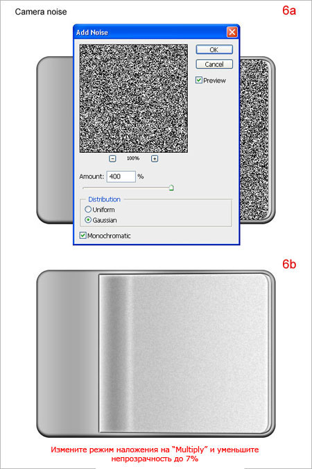 Шаг 6. Нажмите сочетание CTRL + J, чтобы продублировать слой “camera3” и переименуйте его в “camera3 noise”. Увеличьте заливку (Fill) до 100% и удалите стили слоя. Удерживая CTRL, кликните по слою “camera3”, чтобы выделить его содержимое. Выполните команду “Filter > Noise > Add Noise” (Фильтры > Шумы > Добавить шум), настройки показаны на рисунке (6а). Выполните команду Filter > Blur > Blur ( Фильтры > Размытие > Размытие). Измените режим наложения (Blending Mode) на Multiply (Умножение) и уменьшите его непрозрачность (Opacity) до 7% (6b).