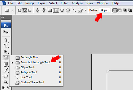(Rounded Rectangle Tool (U)) с радиусом 15 пикселей и нарисуйте контур прямоугольника на холсте.