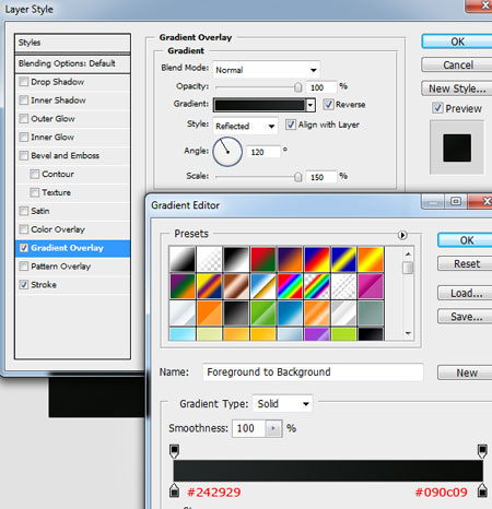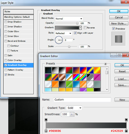 (Gradient Tool (G)) с радиальным градиентом. Установите цвет переднего плана темно-серый (#494c50) и цвет заднего плана очень темный серый (#070908). После этого проведите радиальный градиент от верхнего края выделения к нижнему.