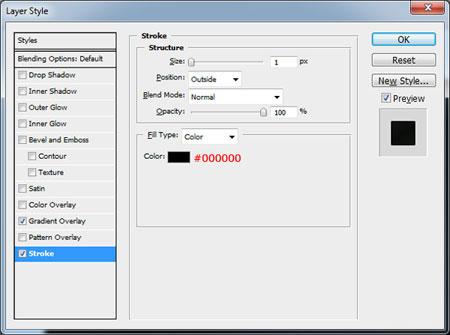 Двойной щелчок по слою «черный экран» и добавьте обводку в 1 пиксель, используя настройки ниже.