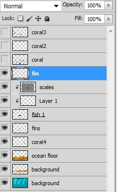 Шаг 19. Спрячем все, что выходит за рамки рыбки, сделав щелчок левой клавишей между слоем «scales» и «fish 1» удерживая клавишу Alt.