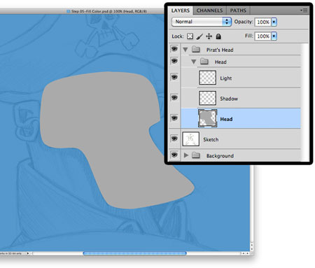 Шаг 5. Создав путь, кликаем по нему правой кнопкой мышки, выбираем Make Selection (Создать выделение) и жмем OK. Создаем новый слой "Голова" и заливаем выделение серым цветом, затем жмем CTRL+D, чтобы деактивировать выделение.
