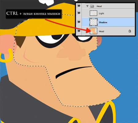 Шаг 9. Активируем слой "Тень", затем создаем выделение вокруг головы (зажимаем клавишу CTRL и кликаем по миниатюре слоя). Скрываем выделение (CTRL+H). Теперь можно создавать тень для головы.