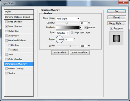 Шаг 3.Щелкните правой кнопкой мыши на слое с фигурой и перейдите в Blending Options (параметры наложения) и примените Inner Shadow (внутренняя тень), Inner Glow (внутреннее свечение) и стиль слоя наложение гридиента (gradient overlay), как показано ниже.