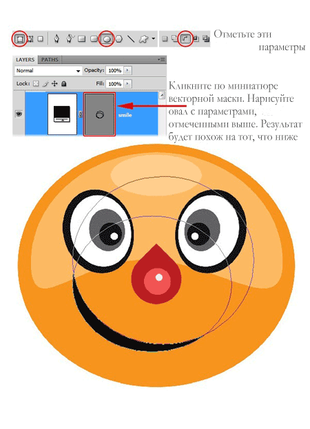 Создайте улыбку точно так же, как мы делали ранее. Нарисуйте овал и выберите параметр Вычесть из области фигуры (Subtract from shape area) в панели настроек. Рисуйте внутри Векторной маски (Vector mask), чтобы вырезать.