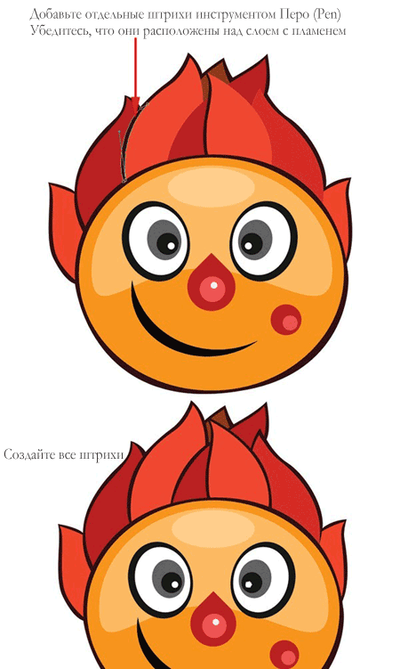 Нарисуйте штрихи у язычков пламени над слоями с ними.