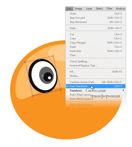 Выделите слои глаза, удерживая клавишу Ctrl и кликая по слоям, и перейдите в Редактирование (Edit) – Свободная трансформация (Free Transform) и поверните глаз примерно на -20 градусов, затем нажмите Enter, чтобы применить трансформацию. Используйте панель Инфо (Info), чтобы определить, как сильно вы наклоняете объект.