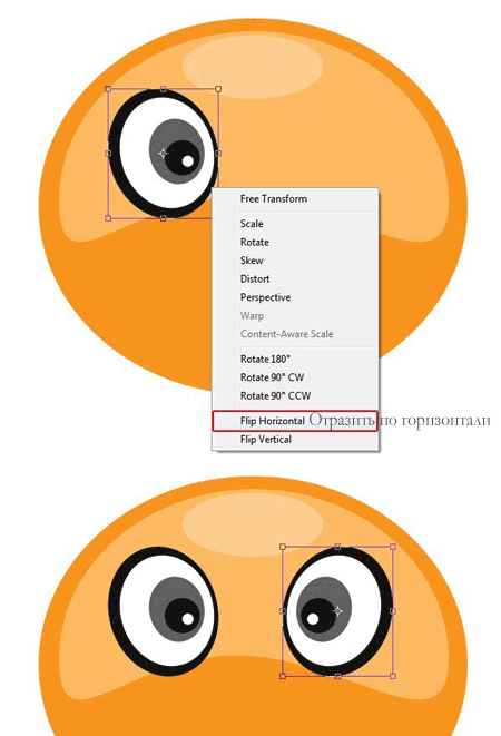Теперь глаз создан на одной стороне, и нам нужно его дублировать и разместить на другой стороне. Чтобы это сделать, выделите слои глаза, выберите Слой (Layer) – Создать дубликат слоя (Duplicate Layers). Так вы дублируете глаз, а теперь нажмите Ctrl+T, затем кликните правой кнопкой мыши внутри появившейся рамки и выберите параметр Отразить по горизонтали (Flip Horizontal) из контекстного меню.