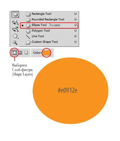 (Ellipse), в его параметрах выберите параметр Слой-фигура (Shape Layer), установите цвет на приятный оранжевый или на #e0912e и нарисуйте вот такую овальную фигуру. Убедитесь, что слой создан в группе “Sun”(Солнце).