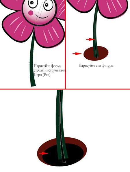 (Pen) (P) нарисуйте стебель. Поместите его под остальными слоями группы. Следуйте шагам на изображении ниже.