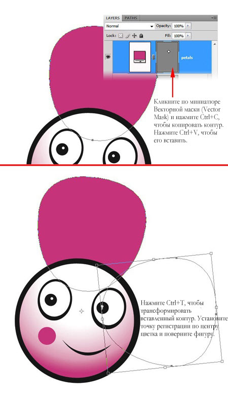 Мы создали один лепесток. Теперь перейдем к хитрой части, мы дублируем лепесток несколько раз и расположим вокруг «лица» цветка. Но это действие создаст много дополнительных слоев. Мы можем избежать дополнительных слоев, рисуя на Векторной маске (Vector Mask). Точно так же, как мы делали ранее. Просто кликните по миниатюре Векторной маски (Vector Mask) лепестка, это действие выделит контур. Теперь нажмите сочетание клавиш Ctrl+C, чтобы копировать существующий контур и Ctrl+V, чтобы вставить его. Контур будет вставлен в то же место, откуда мы его скопировали. Нажмите Ctrl+T, чтобы трансформировать его, установите центровую точку где-нибудь в середине лица цветка. Удерживайте угол ограничительной рамки и разверните лепесток.