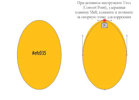 Возьмите инструмент Стрелка (Direct Selection) выделите нижнюю опорную точку овальной фигуры и, удерживая клавишу Shift, протяните ее вверх по центру. Установите Непрозрачность (Opacity) слоя на 60%.