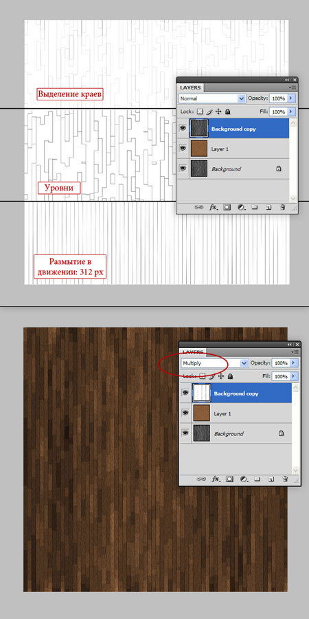 Шаг 5. Дублируем (CTRL+J) базовый фоновый слой и перемещаем его в самый верх панели слоев. Переходим Filter - Stylize - Find Edges (Фильтр - Стилизация - Выделение краев). Используем Levels (Уровни) (CTRL+L), чтобы увеличить контраст линий, и еще раз применяем фильтр Motion Blur (Размытие в движении). Устанавливаем режим смешивания слоя на Multiply (Умножение). Как вы видите, текстура стала более интересной.